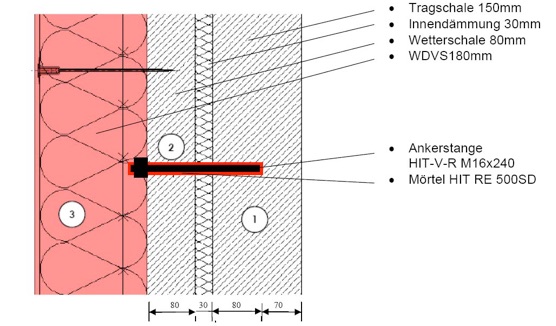 Um zu verhindern, dass nach der Sanierung Schäden an der WDVS-Fassade auftreten – z.B. verursacht durch Verschiebungen der Wetterschale infolge zusätzlicher Lasten und ungenügender Verbindungsmittel – sollen die beiden Schalen kraftschlüssig miteinander verbunden werden.